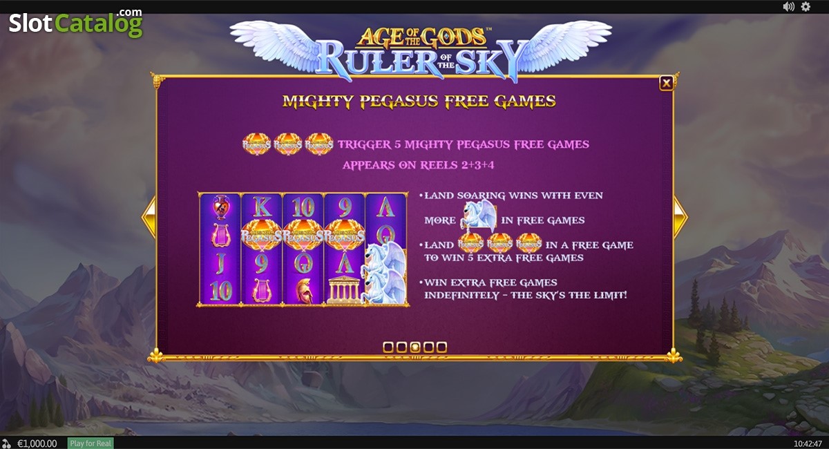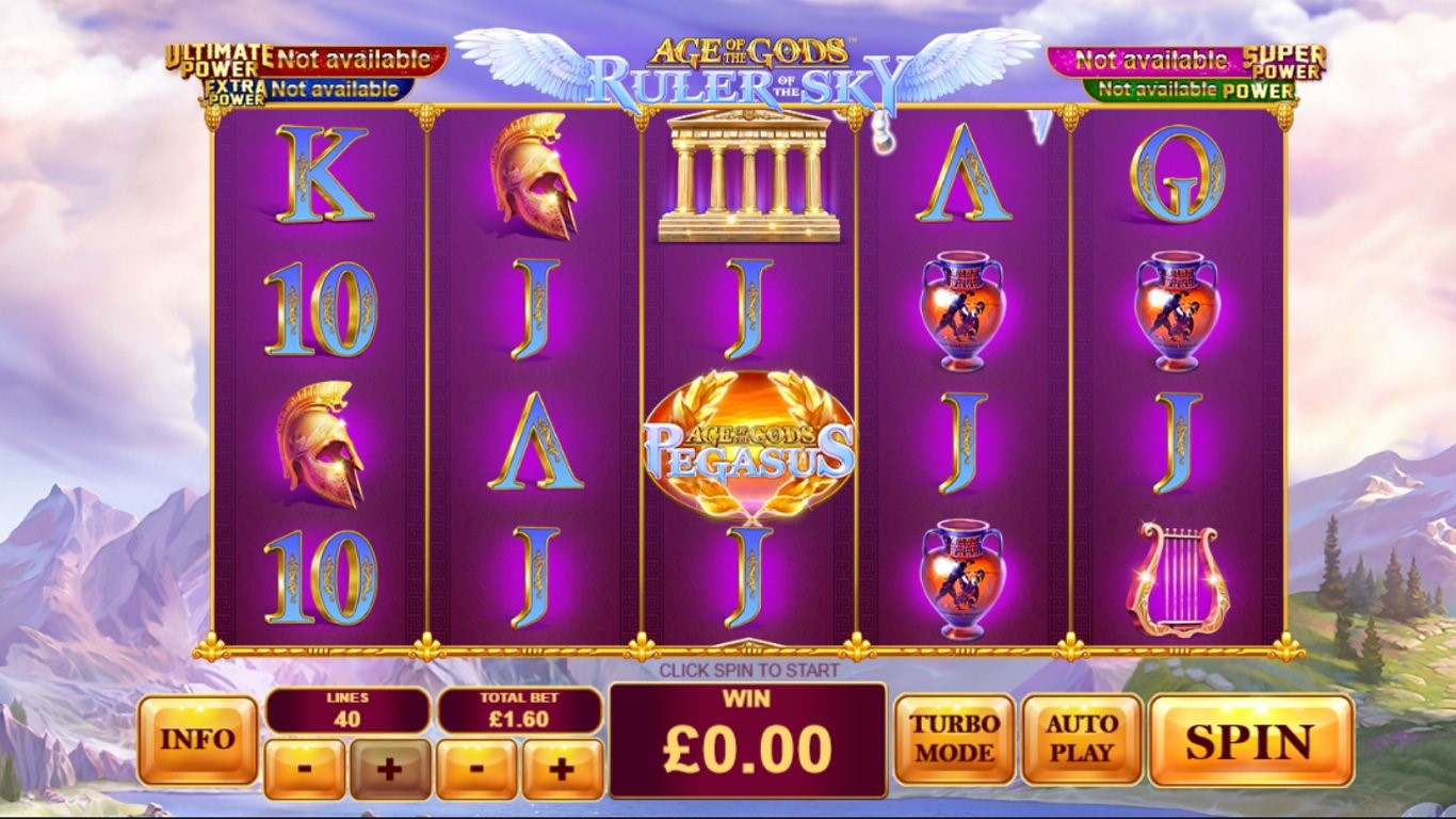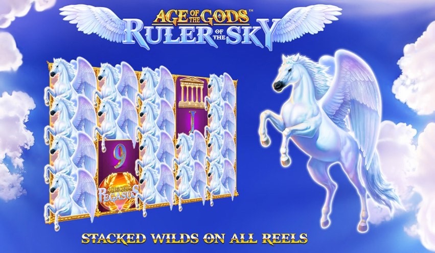 Age of the Gods Ruler of the Sky se basa en Pegaso, que es un mítico caballo divino alas; diseñado de una manera hermosa; la tragamonedas tiene un toque mítico y mágico. Con un precioso fondo nublado, los símbolos en los carretes incluyen naipes A, K, Q, J, 10 y 9, arpas, jarrones, templos y cascos atenienses.