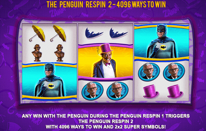 En esta función, los símbolos estándar del juego aparecerán en bloques de 2×1. Por otro lado, los símbolos de Batman, Robin y del Pingüino aparecen como súper símbolos de 2×2, multiplicando los valores de pago e incrementando la cantidad total ganada.