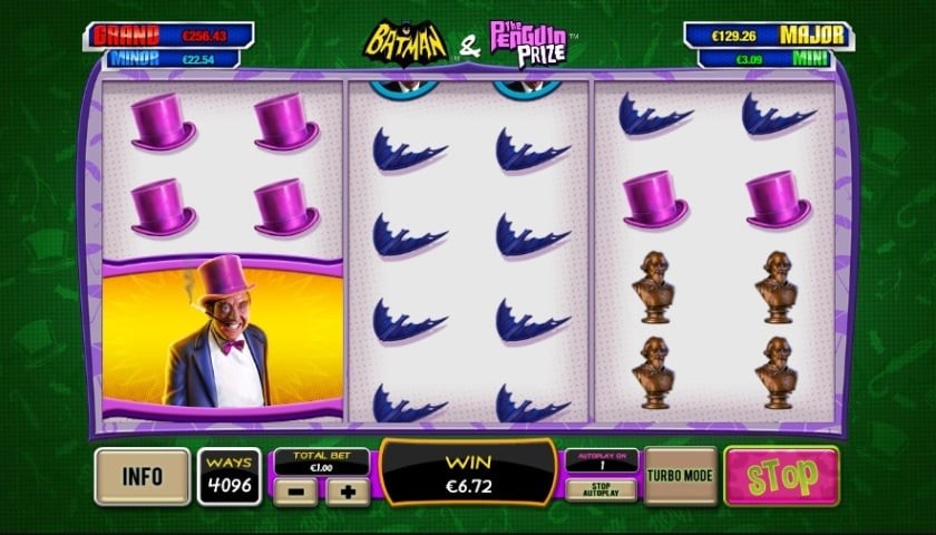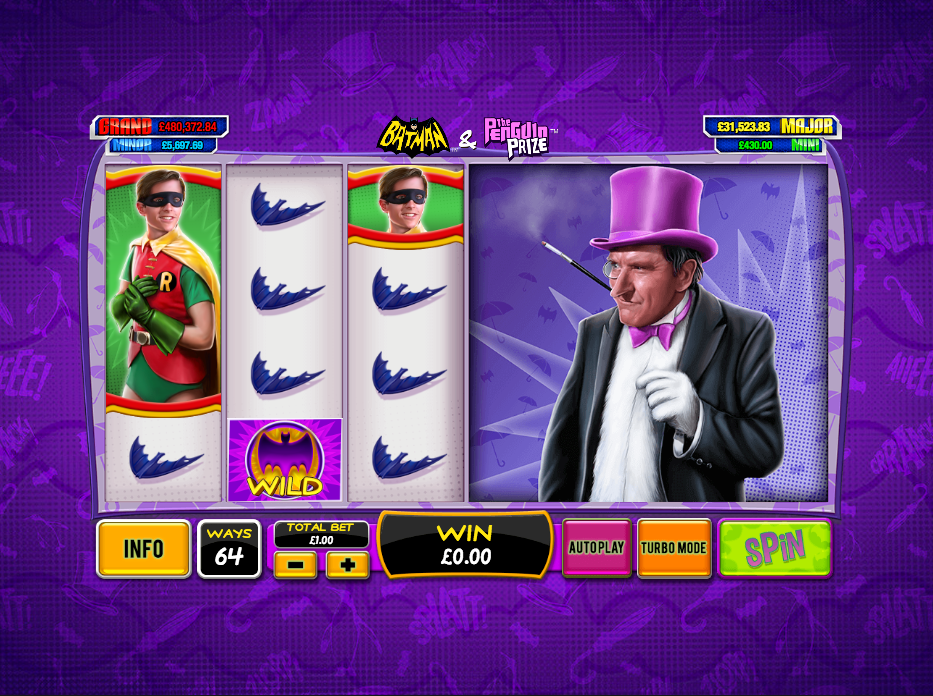Al inicio del juego tendrás tres carretes con los cuales ganar y 64 maneras para hacerlo. Si Batman nos ha enseñado algo, es que la paciencia es una virtud, y vas a tener que ganar esos grandes pagos. Cuando aterrices en una combinación ganadora del lado de Batman, se te dirigirá para jugar del lado de Pingüino. Esto se juega en otro conjunto de tres tambores, pero con 4.096 maneras de ganar en su lugar.