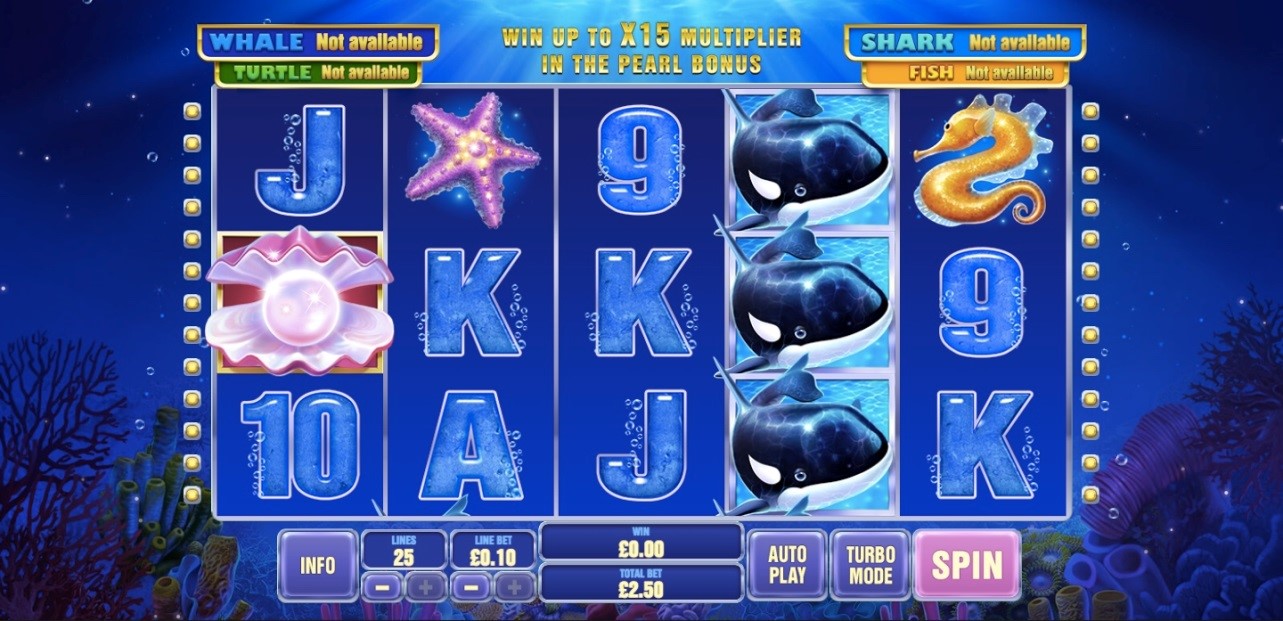 La dispersión tiene el símbolo de concha de mar y perla: 2, 3, 4 o 5 en una línea de pago te recompensarán con 2, 5, 20 o 200 veces tu apuesta total respectivamente. Si obtienes 3 o más, activarás la función de Bono de Perla. Comenzando con 8 jugadas gratis y un multiplicador de 2 veces, eliges 2 de 5 conchas marinas para ganar jugadas gratis adicionales y/o multiplicadores. Tienes que escoger monedas, y 3 idénticas te dan el bote correspondiente; en orden ascendente de valor, tienes los botes de Peces, Tortugas, Tiburones y Ballenas.