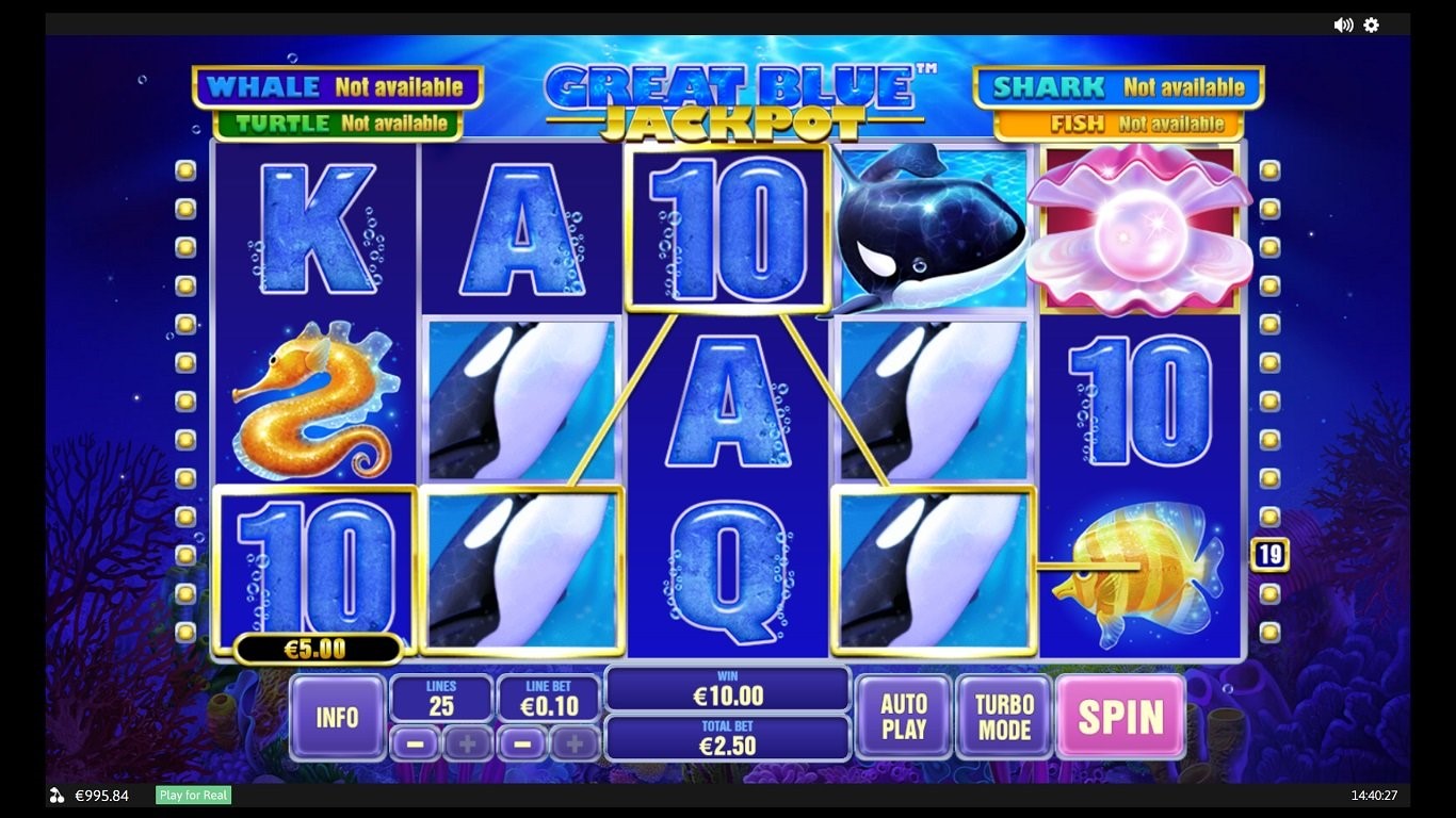 Aparte de estos especiales, el Bote Great Blue también tiene 5 símbolos de imagen que ofrecen pagos medios y 6 símbolos de carta que ofrecen los pagos más bajos en el juego. La parte superior de la cadena alimenticia aquí es el símbolo del tiburón y es seguido por la tortuga marina, peces, caballitos de mar, y estrellas de mar, que en conjunto ofrecen pagos entre 2 y 750 veces nuestra apuesta. En cuanto a los símbolos de la tarjeta, solo el 9 paga por una combinación de 2 símbolos, mientras que el resto de ellos ofrecen pagos cuando recoges 3 o más símbolos.